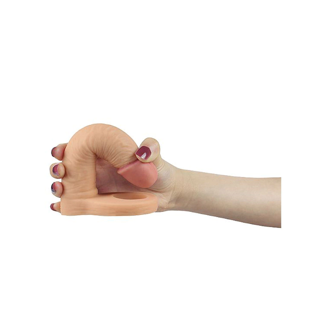 Anel companheiro com prótese realística em formato de pênis com glande definida, saliências e cápsula vibratória interna com 10 modos de vibração.
