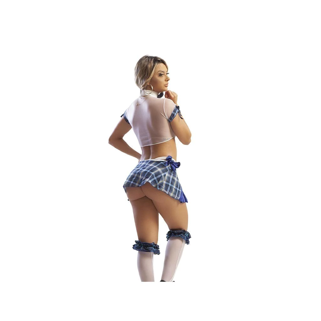 Deixe seu amor louco, totalmente fascinado por você! A fantasia Colegial Tifany levará a imaginação além com muita transparência. Composta por uma blusa em tule transparente amarrada na frente com detalhes em tecido xadrez nas mangas, conta também com uma mini saia fechada em velcro com detalhes de botões na frente e um laço na lateral, gargantilha e calcinha fio dental. Seja uma boa menina!